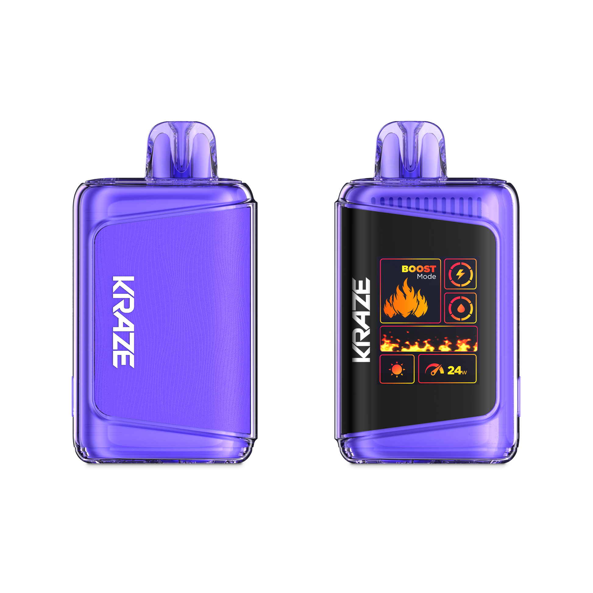Mighty grape flavours come together with wild tart notes to create the perfect puff with a cooling finish.The Grape Ice flavour Kraze HD Mega 20K delivers up to 20000 puffs of vapor with 20mL of e-liquid, and features adjustable airflow, a 1.77" OLED screen, and boost mode.